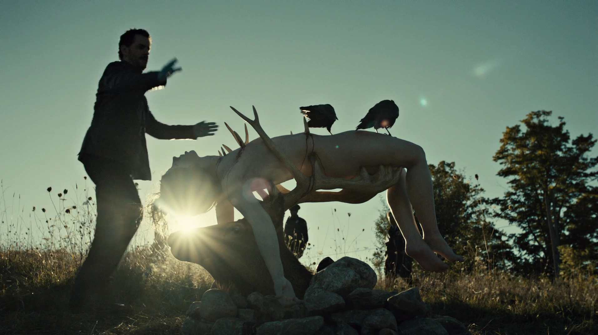 Stag alert! While showering Will sees a vision that will permeate the rest of the show: a black stag with massive antlers glaring at him. This one has feathers, just like the crows swarming the latest victim of the faux Shrike. The stag is how Will’s mind processes the evil he’s coming into contact with. Hannibal’s evil, but we of course don’t know that yet.